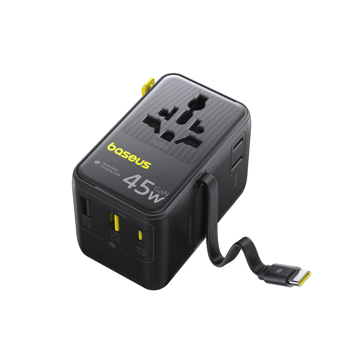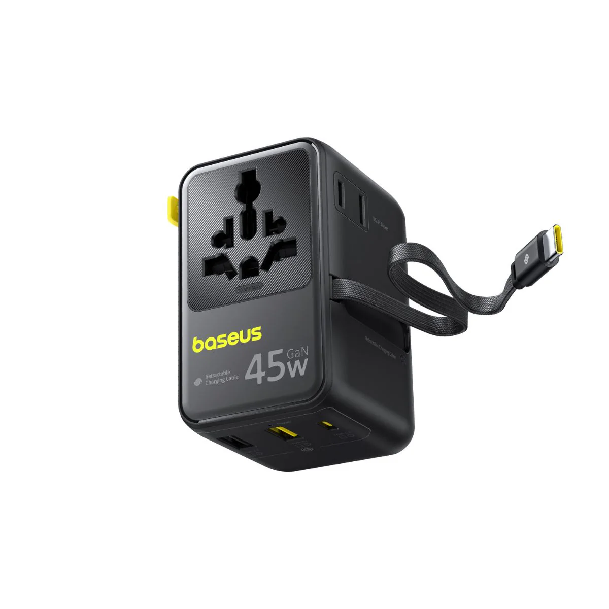 With a 6-in-1 configuration, the adapter includes 2 universal AC sockets, 2 USB-C ports (including the retractable cable), and 2 USB-A ports. This allows you to charge smartphones, tablets, laptops, and other devices simultaneously from a single compact unit.