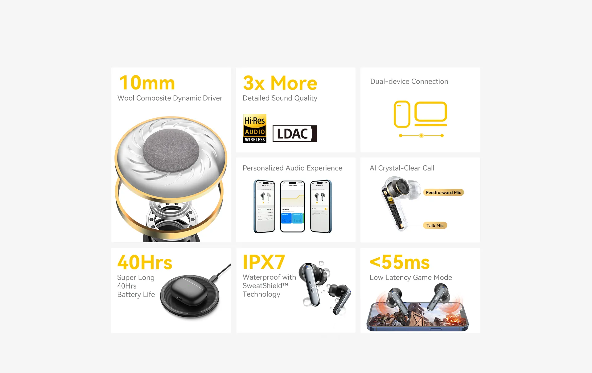 • Immersive Hi-Res Sound with 10mm Wool Composite Dynamic Drivers