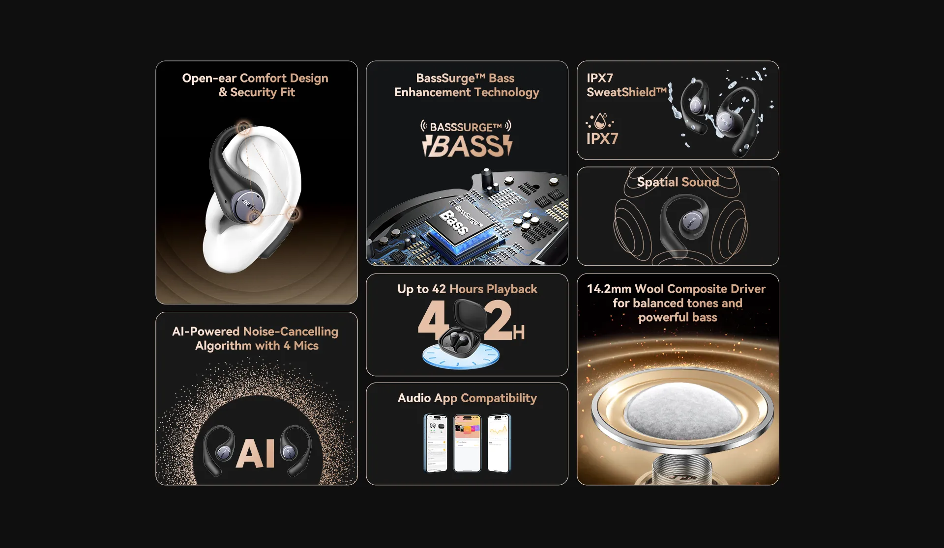 • Ultra-lightweight, open-ear comfort with soft materials for all-day wear.
