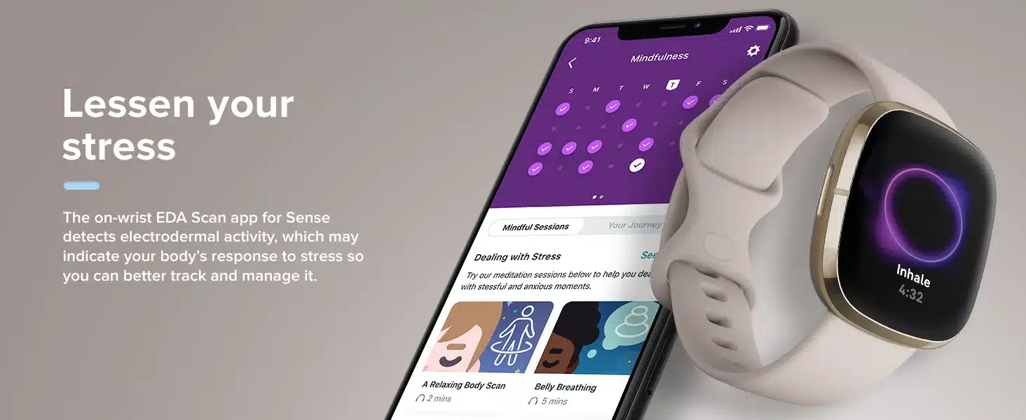 • Stress Management: Features an Electrodermal Activity (EDA) detector via the EDA Scan app to measure small electrical changes in your skin, which may indicate your body’s response to stress. It provides a Stress Management Score and offers guided breathing/mindfulness sessions through the Relax app.