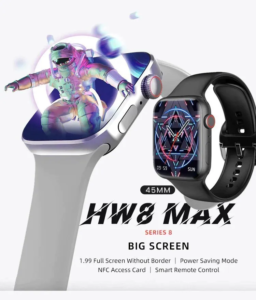 This smartwatch has 1.99 Inch Full Screen Without Border | Power Saving Mode | NFC Access Card | Smart Remote Control | New Border Design, Health Monitoring, Voice Assistant, Sport Mode, Retina Full Screen, Wireless Charging. The HW8 Max smartwatch body is made of zinc alloy while the strap is available in silicone. IPS touch screen that supports an always-on display and is created with a resolution of 420*480 pixels. HW8 Max is an IP67 waterproof smartwatch, which means you can wear it when you wash your hands or on rainy days. The fitness tracker has a heart rate sensor, which collects data on our heart rate over 24 hours. This smartwatch also helps you to control your sleep, thanks to its complete sleep monitor. It also has a pedometer and allows us to control and estimate the calories burned throughout the day.