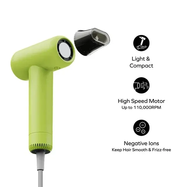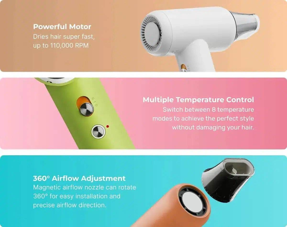 • Ultra-Speed Drying: Features a powerful 110,000 RPM brushless motor that provides a strong, high-speed airflow to dry hair quickly and efficiently.