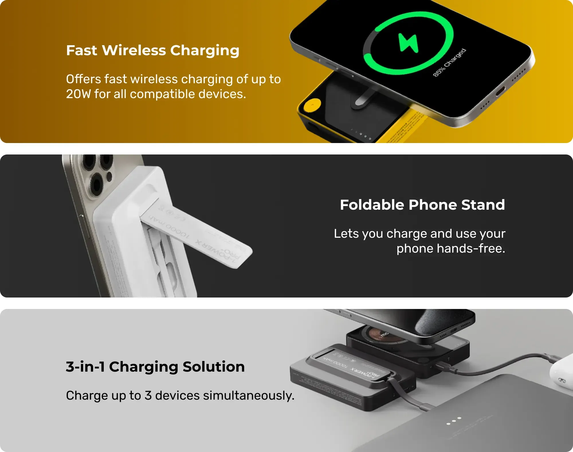 Charge 3 devices simultaneously. Go wireless. Use the USB-C port. And enjoy the versatility of the built-in USB-C cable, letting your charge directly when needed. Say goodbye to tangled cables. Perfect for people who use multiple devices.