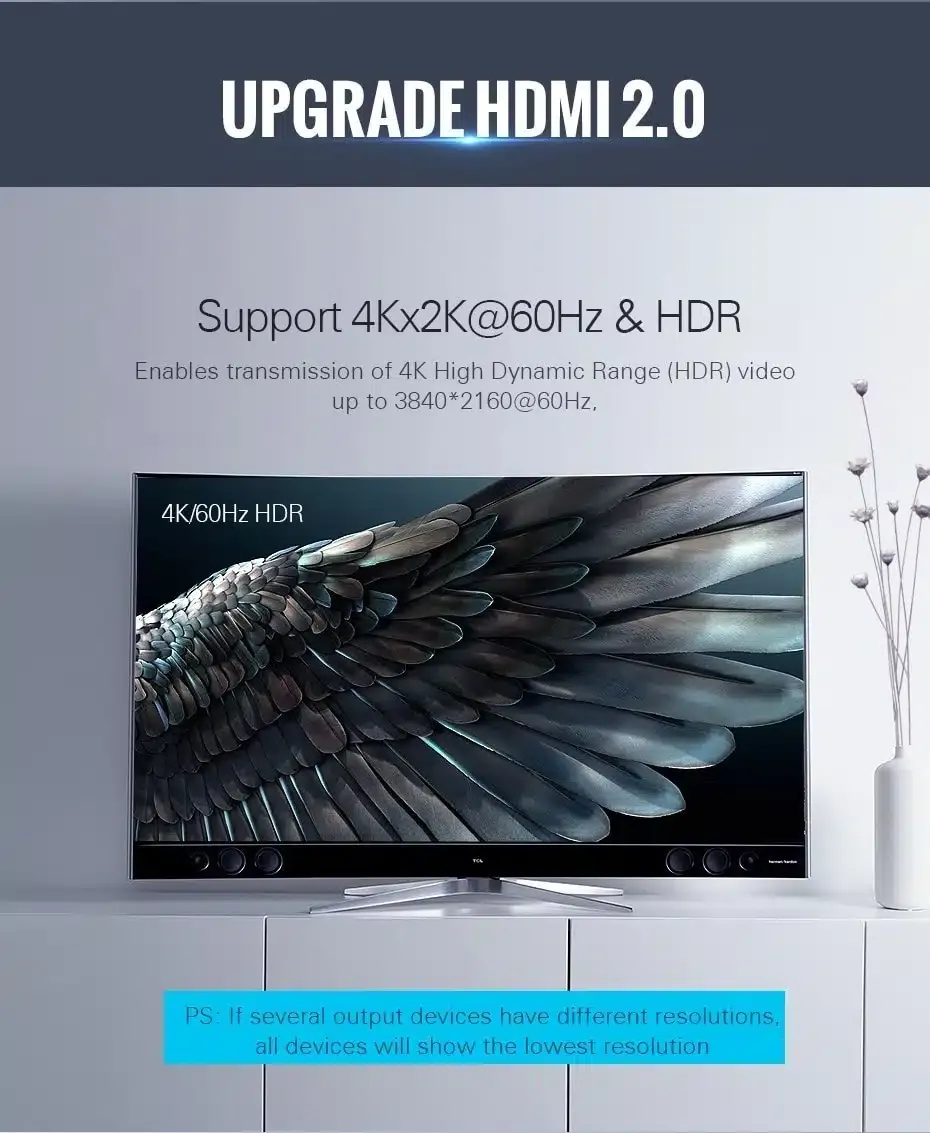 • Enables transmission of 4K High Dynamic Range (HDR) video up to 3840*82160@60Hz (If Several output devices have different resolutions, all devices will show the lowest resolution)