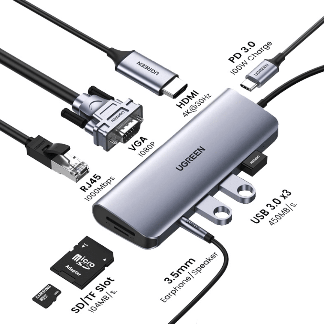 > 10-in-1 USB-C Hub Expansion: UGREEN 10-in-1 USB C docking station features a Gigabit Ethernet, a Type C PD charging port, a 4K HDMI port, a 1080P VGA port, 3 USB 3.0 Ports, an SD/TF Card reader and a 3.5mm audio jack. All ports of the multiport adapter can be used simultaneously allowing you to connect a keyboard, mouse, USB driver, external disk, and headphones to your device.